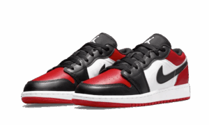 The AJ Jordan 1 Low Bred Toe 2021 sports the iconic colors: black, red and white. We find the swoosh , the mudguard and the black eyelets associated with the toebox as well as the outsole in red. The midsole matches the quarter panel to contrast with the rest of the design.
