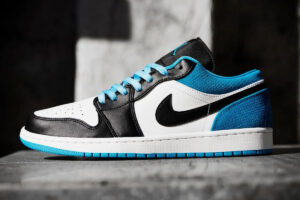 The AJ Jordan 1 Low SE Laser Blue has a leather base mixing black and white. Added to this we find perforated suede overlays in a Laser Blue tone. The classic branding elements are present on the pAJ: the side swoosh , the Jumpman on the tongue and the Wings Logo on the heel embroidered tone on tone.