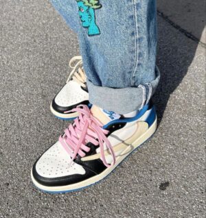 The AJ Jordan 1 Low Travis Scott Fragment sports the iconic colorway of the Japanese brand on a premium leather structure: there is a white base with blue and black inserts. Note the famous cream-colored inverted swoosh of La Flame that matches the laces and midsole. To finalize this design, the signatures of the collaborators are present on the heel.
