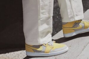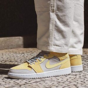 This AJ Jordan 1 Mid Mixed Textures Yellow as its name suggests sports a summer color, which is yellow combined with the color gray. Part of the “Mix Materials” pack, we find an upper mixing several premium materials, such as leather, suede and a woven fabric. Classic branding elements are present on this model such as the swoosh , the Wings logo and Jumpman tag on the tongue.