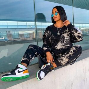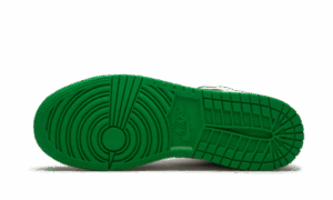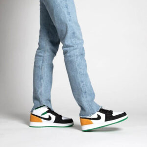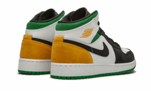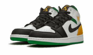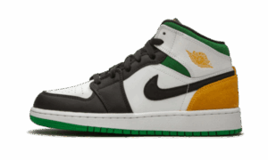 The AJ Jordan 1 Mid SE White Laser Orange Lucky Green features a white leather upper with black inserts at the mudguard and swoosh . For the touch of color, we find green on the ankle and outsole, as well as yellow on the heel and for the Wings Logo .
