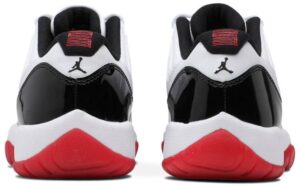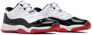 AJ Jordan 11 Retro Low ‘Concord-Bred’ features a design that combines two of the model’s most iconic OG colorways. The white leather upper is reminiscent of the ‘Concord’ Jordan 11, highlighted by tonal webbing lace loops and black patent leather overlay. Meanwhile, the pAJing of the white foam midsole with a semi-translucent red rubber outsole immediately calls to mind the ‘Bred’ colorway.