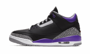 The AJ Jordan 3 Retro Black Court Purple sports a black grained leather upper combined with touches of purple on the upper ankle and sole. The classic elephant print and light touches of orange perfect the silhouette.
