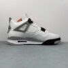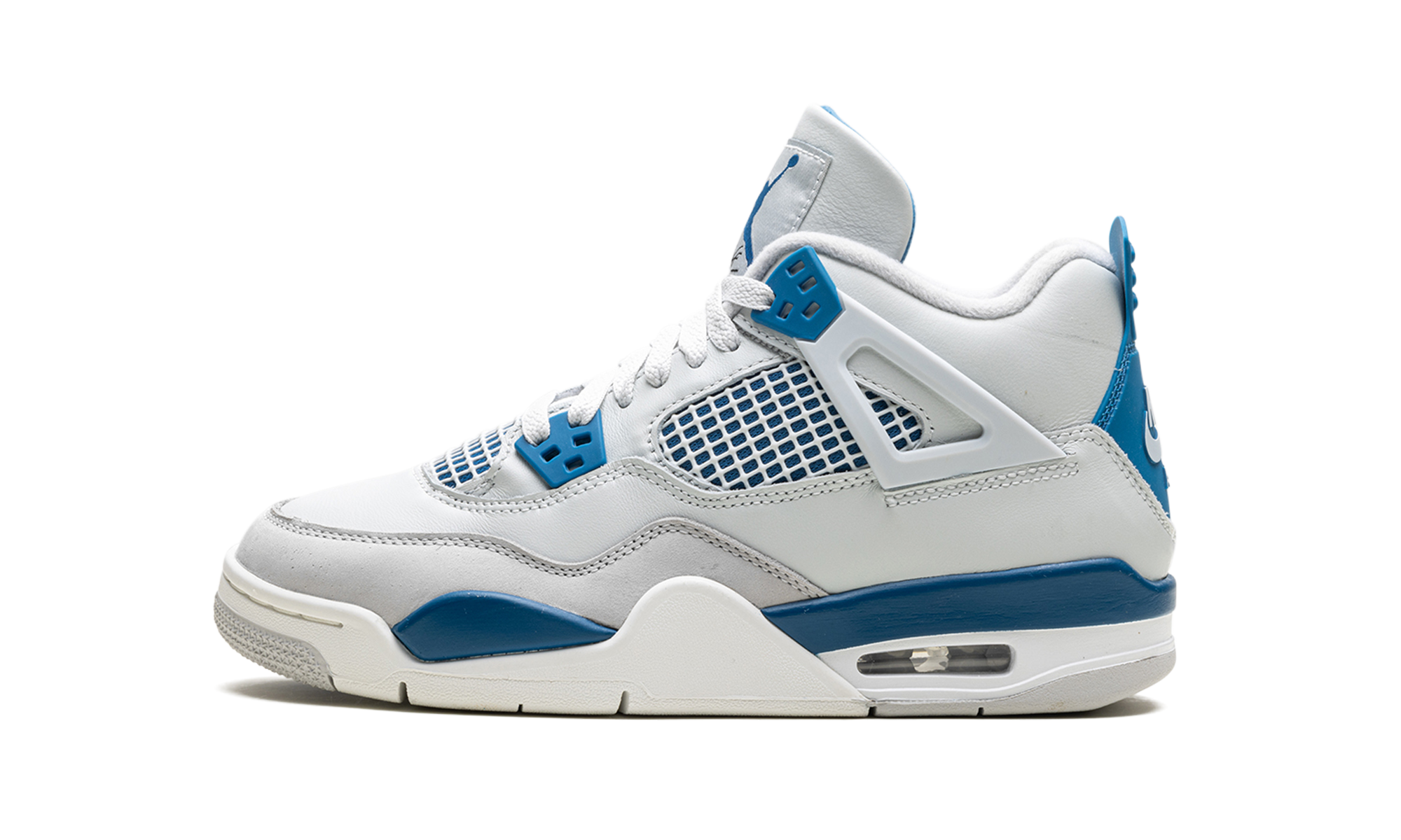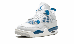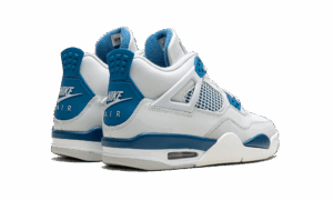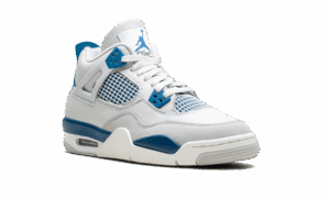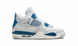 The AJ Jordan 4 GS “Military Blue” is the youth sizing of an original colorway of Michael Jordans fourth signature shoe that was re-released in May 2024. The Jordan 4 Military Blue is one of the retro basketball sneakers original colorways, and one of its rarest, too. The style was only released twice before, in 1989 and 2006, until it was brought back in 2024. The modern version of the Military Blue remains faithful to the original look, in that it features the same shape, color block, and Nike AJ branding as the 89 version. The shoe has a white leather upper with a Neutral Grey overlay on the toe. Additional Neutral Grey accenting appears on the lace holder wings. White netting is layered over Military Blue mesh on the mid-panel and tongue. More Military Blue accenting comes into play on the mudguard and lace eyelets, and on the heel counter with Nike AJ detailing. A blue Jumpman is found on the tongue. Underfoot, a white rubber midsole and grey rubber outsole complete the look Military Blue