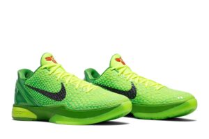With regard to its performance features, the Nike Zoom Kobe 6 Protro ‘Grinch’ also boasts a stylish and unique design. The bright green colorway is accented with black and red detailing, creating a striking contrast that is sure to turn heads. The tongue of the sneaker features Kobe Bryant’s signature logo, adding a personal touch to these iconic kicks.