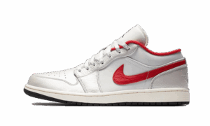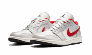 The AJ Jordan 1 Low Night Track consists of a white leather base enhanced by Metallic Silver inserts . The details of red present at the level of the side swoosh and the collar of the pAJ bring character and color. We find the Jordan logo embroidered on the tongue in black and the outsole is the same color which slightly contrasts the whole of the model which is clear overall.