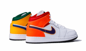 The AJ Jordan 1 Mid Alternate Multi-Colo r is unique, it has a different color for each foot. In common on both feet, we find the white leather on the upper, the white laces and the black outsole. On the left foot, the swoosh is blue, yellow and green for the ankle and the top of the shaft. In contrast, on the right foot, the ankle is in shades of orange and red with a purple swoosh .