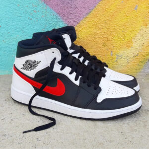 The AJ Jordan 1 Mid Black Chile Red White sports a black leather upper combined with white inserts, like the toebox, eyelets and heel of the pAJ. For a touch of color, there is a side swoosh and the Jumpman on the tongue in red.