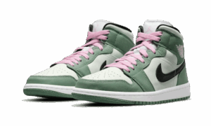 The women’s AJ Jordan 1 Mid SE ‘Dutch Green’ softens the classic silhouette with a spring-ready palette made up of contrasting pastel hues. Varying pale green shades are executed on the leather upper, accented with a black Swoosh and a pink Wings logo on the lateral collar flap. Matching pink hits land on the sneaker’s laces and woven tongue tag, featuring standard Jumpman branding. The mid-top is mounted on a rubber cupsole with encapsulated Nike AJ cushioning in the heel.