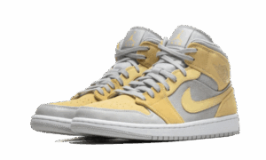 This AJ Jordan 1 Mid Mixed Textures Yellow as its name suggests sports a summer color, which is yellow combined with the color gray. Part of the “Mix Materials” pack, we find an upper mixing several premium materials, such as leather, suede and a woven fabric. Classic branding elements are present on this model such as the swoosh , the Wings logo and Jumpman tag on the tongue.