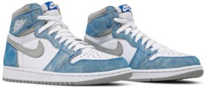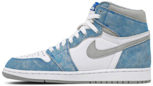 The AJ Jordan 1 Retro High OG ‘Hyper Royal’ takes on a weathered aesthetic, highlighted by a white leather upper with faded blue suede overlays. Contrasting neutral grey hits land on the Swoosh and padded collar, adding to the sneaker’s understated palette. OG branding elements include a Jordan Wings logo on the lateral collar flap and a woven Nike tongue tag. The high-top is mounted on a standard AJ1 rubber cupsole, featuring encapsulated Nike AJ cushioning in the heel.