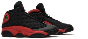 The AJ Jordan 13 received a retro update in 2017 outfitted in its original color scheme. The AJ Jordan 13 Retro ‘Bred’ 2017 features a black leather upper with matching 3M reflective ballistic mesh overlays on the sidewall. The sneaker also boasts a padded tongue for added comfort, True Red suede overlays, and the iconic green hologram on the ankle.