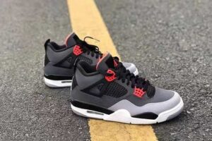 Product Description: The AJ Jordan 4 Infrared features a tonal grey Durabuck upper with black TPU mesh inserts, tech straps, and heel tabs. Hits of Infrared on the lacing system and woven Jordan Flight tongue label add a sharp contrast to the neutral-toned base. From there, a white sole with visible AJ units completes the design.