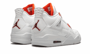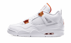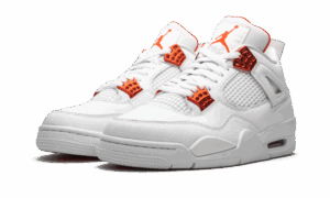 The AJ Jordan 4 Retro Metallic Orange sports a high- quality white leather base as well as laces and a sole in the same color. The eyelets are orange with a metallic effect and are combined with the inner tongue lining and branding elements.