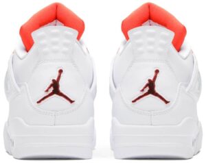 The AJ Jordan 4 Retro ‘Orange Metallic’ dons an all-white leather build, with its white monochromatic finish punctuated by sharp bursts of Team Orange on the eyelets, interior tongue and Jumpman branding hits, located on the woven tongue tag and heel. The visible Max AJ unit embedded in the heel of the midsole is similarly tinted orange. The kicks dropped alongside three additional colorways in Court Purple, University Red and Pine Green.