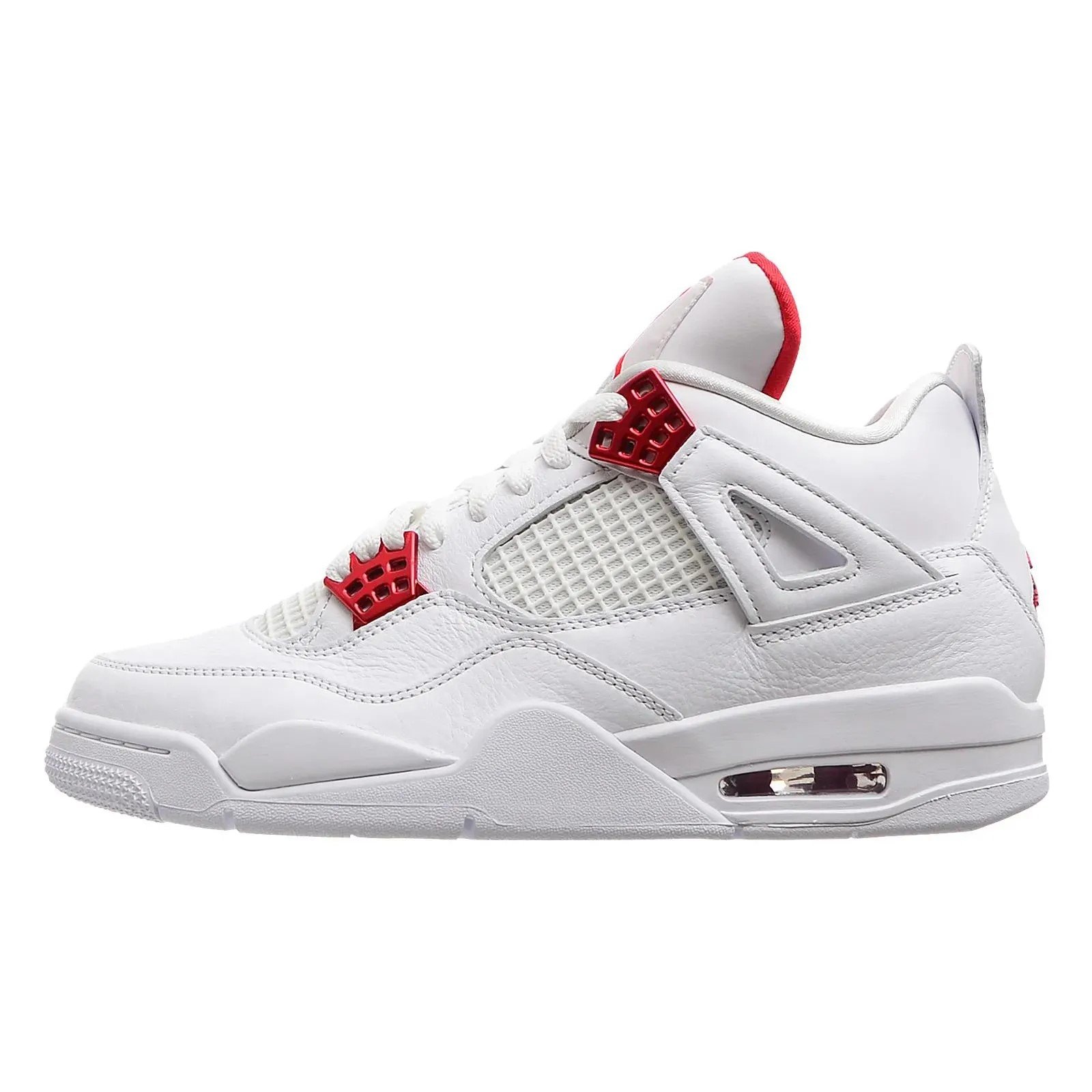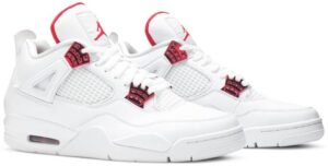 Launching as part of a four-piece Metallic Pack, the AJ Jordan 4 Retro ‘Red Metallic’ treats the classic silhouette to a simple two-tone color scheme. The upper is constructed from white leather, complete with standard details that include quarter-panel netting and a visible AJ sole unit at the heel. Contrasting pops of University Red appear on the molded eyelets, interior tongue and Jumpman branding hits at the heel and woven tongue tag.