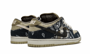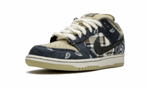 The Travis Scott x Nike SB Dunk Low is the rap superstars first collaboration with Nikes skate imprint on the revered Dunk model. Scott, a fan and collector of coveted Dunks from the shoe’s mid-aughts heyday, previously teased his Nike SB collaboration during his JACKBOYS video and quickly put the sneaker world on notice. Dark navy blue paisley panels along the heel and forefoot contrast the plaid pattern found on the mid-panel and perforated khaki toe. Each shoe has dusty pink and black Swooshes on opposite sides of the upper. Scott opts for extra wide white rope laces and signature Cactus Jack branding on the tongue. A white midsole and tan-colored outsole complete Scott’s unique take on the classic skate shoe. Release date: February 29, 2020. Travis Scott